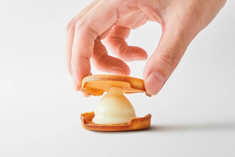 生地に練り込む・噴霧する・纏わせる、三層のチョコレートで濃厚さを実現したチョコレートチップス。極薄生地を独自の揚げ焼き製法で仕上げ、粉雪のような口どけを目指した一品です(製造に手間がかかるため数量限定)。