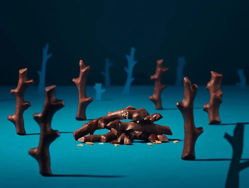 フィアンティーヌ、ローストアーモンド、香ばしいパイを合わせたサクサク食感のクリスピーチョコレート。ミルクとスイートの絶妙なブレンドで、作品「森の見る夢」に着想を得た3つの樹形を模した形状です。