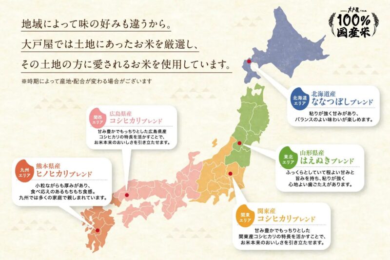 国産米100%、地域ごとに選ぶ“その土地のごはん”
