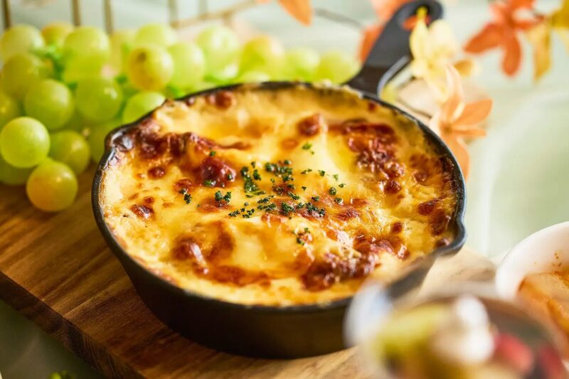 メインディッシュは、帯広の豊西牛を香味野菜とトマトで煮込み、クリームソースとさつまいも・レンコンなどの秋の味覚を重ねたラザニアに仕立てます。