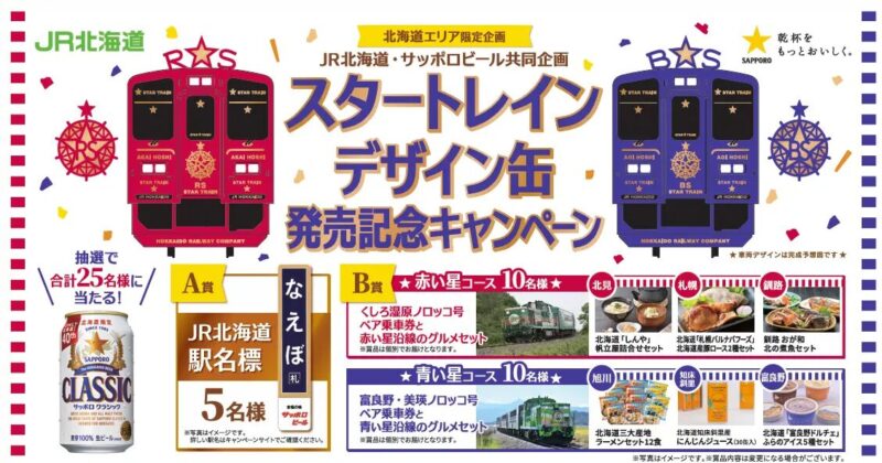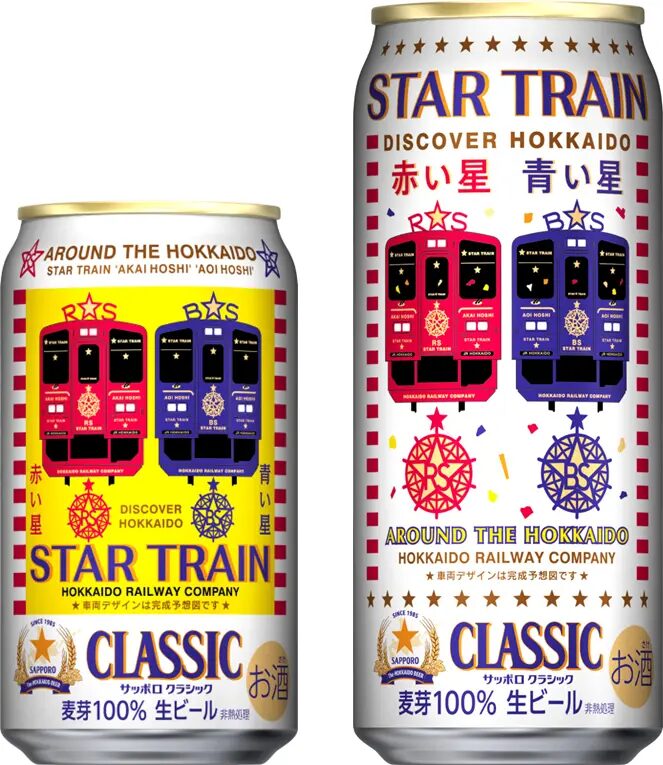 サッポロビールとJR北海道の共同企画として、北海道限定ビール「サッポロ クラシック」の特別デザイン缶が11月11日(火)から数量限定で登場します。JR北海道が推進する「スタートレイン計画」に連動し、2027年運行開始予定の観光列車「赤い星」「青い星」をモチーフにした一品。中味は通常のサッポロ クラシックです。
