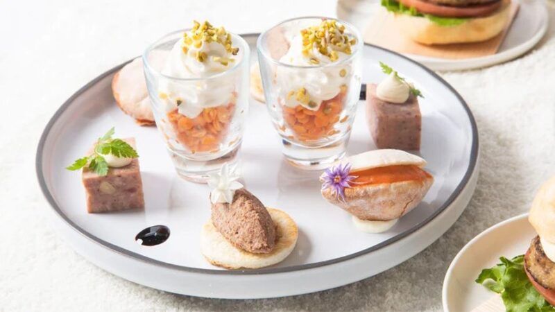 「白雪 ‐ WHITE MOMENTS ‐」のメニューは、3段スタンドとグランデセール、ミニハンバーガーで構成されています。1段目はセイボリーで、サバのリエット、サーモンムースの小さなピタパン、ピンクレンズ豆と林檎のサラダ、ポークパテが並びます。