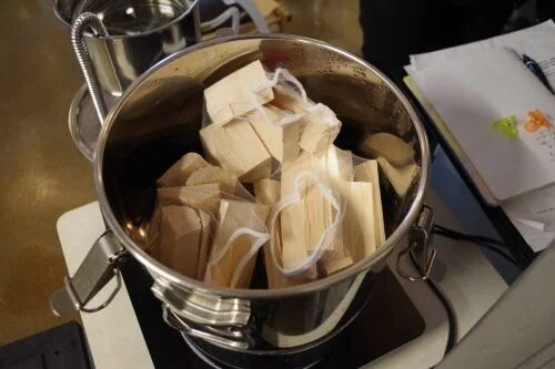 その後、加工した木材から水蒸気蒸留で「芳香蒸留水」を取り出し、ビールに添加します。この工程で、バットの香りをビールに移していきます。水蒸気蒸留の様子や仕組みも紹介され、香りの抽出がどのように行われているかを見ることができます。