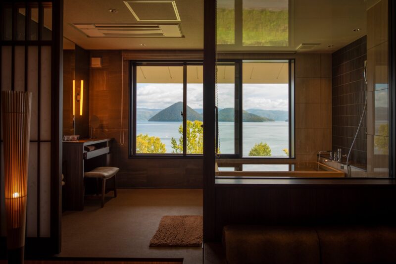 客室はすべてレイクビューで、自家源泉から汲み上げた天然温泉(加温)を、客室内の浴室でかけ流しで楽しめます。洞爺湖を望むプライベートな空間で、心ほどける湯浴みの時間を過ごせます。