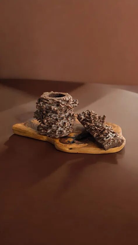 クリスピーバウムクーヘンシリーズから生まれたカカオフレーバー。切り株のようなフォルムと二層の食感はそのままに、発酵バターの香りにカカオの深いコクとほろ苦さを重ねています。
