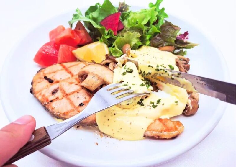 バター醤油でソテーしたサーモンに、グリルきのこ、濃厚なオランデーズソースを合わせた一皿です。半熟卵を割った瞬間、とろりとあふれる黄身がサーモンときのこに絡み、香ばしい香りとともに食欲をそそります。