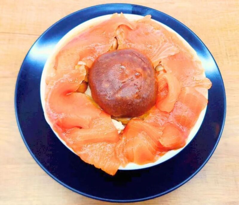 中央にどんとしいたけが構え、そのまわりをスモークサーモンがぐるりと囲み、まるで“瞳”のような盛りつけになっています。味噌ベースのスープにきのこの旨味が重なり、麺に絡むとろみが冷えた体をゆっくり温めてくれます。