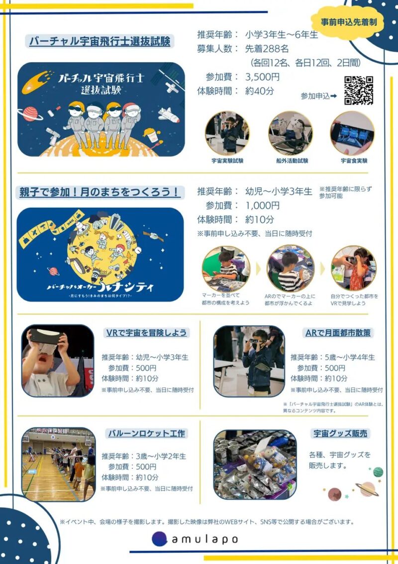 会場では、年齢や興味に合わせて選べる複数の宇宙体験コンテンツが用意されています。