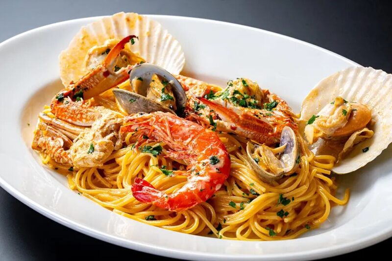 北海道産ホタテやアサリに加え、海老が贅沢に入ったトマトクリームソーススパゲティです。濃厚なトマトクリームに、海の旨味が詰まった具材がごろごろと入った一皿で、北海道の海の幸をたっぷり堪能できます。