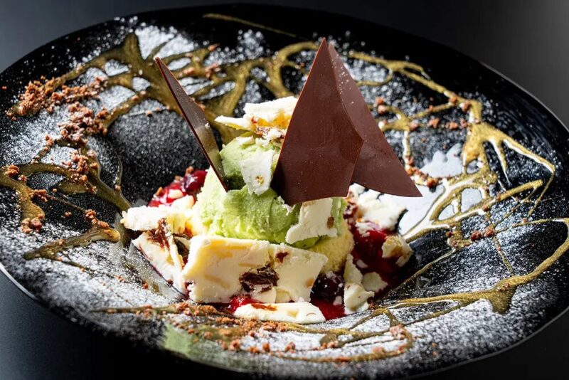 聖なる夜に雪が舞い降りる様子をイメージした、見た目も華やかなクリスマス限定ドルチェです。爽やかなベリーソースと濃厚なピスタチオジェラートの組み合わせで、食後の一口を贅沢に締めくくれます。