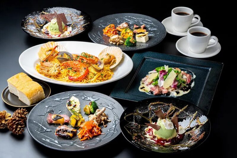 北海道産ホタテたっぷりのパスタに十勝若牛のタリアータ、締めは“雪降るクリスマスドルチェ”。単品でも二人用セットでも選べます。手軽にクリスマス気分を味わえそうな限定メニューです。