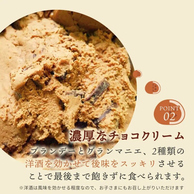 餅チョコは、ふわもちのお餅、とろけるチョコクリーム、カリッとしたカカオ55%クーベルチュールチョコチップの三つの食感が一度に楽しめるスイーツです。洋酒(ブランデー&グランマニエ)は香り付け程度で、お子さまにも安心して食べられるようにしています。