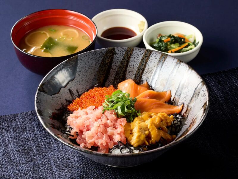 ミョウバン不使用のウニに、粗めにたたいたまぐろ、サーモン、とびっこを盛り付けた海鮮丼です。みそ汁と季節の小鉢が付きます。