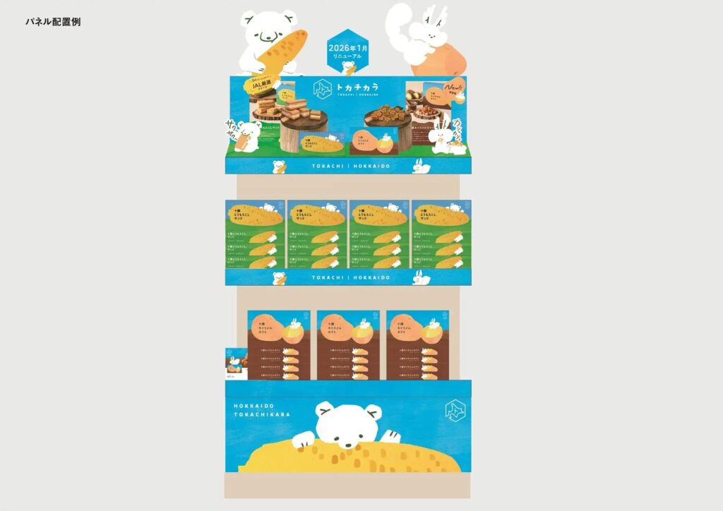 パッケージとショッパーは、「十勝晴れ」の雲一つない晴天の空と広大な大地を思わせる鮮やかな配色で、十勝にゆかりのある動物キャラクターを描いた親しみやすいデザインになります。動物キャラクターは商品ごとに異なり、「十勝とうもろこしサンド」にはシロクマ、「十勝キャラメルポテト」にはエゾリスが描かれます。