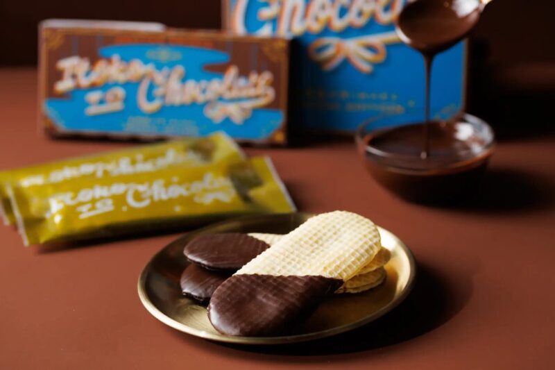 「北海道バターのいとこ」は、バター香るゴーフレット生地に、ミルク感たっぷりのスキムミルクジャムをサンドした“ふわっ・シャリッ・とろっ”の食感が特徴です。新作「いとことチョコレート」は、その「北海道バターのいとこ」をベースに、半分に一つひとつ手作業でチョコレートをまとわせています。