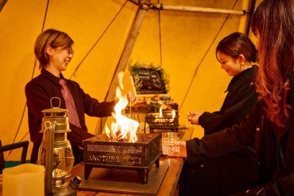 4回目の開催となる今回は予約制を廃止し、より気軽に立ち寄れるスタイルへ刷新しました。テント内には新たにバーカウンターを設置し、専属バーテンダーが常駐します。アルコールのほかノンアルコールドリンク、季節限定のホットチョコレートなども用意し、幅広いラインアップで提供します。