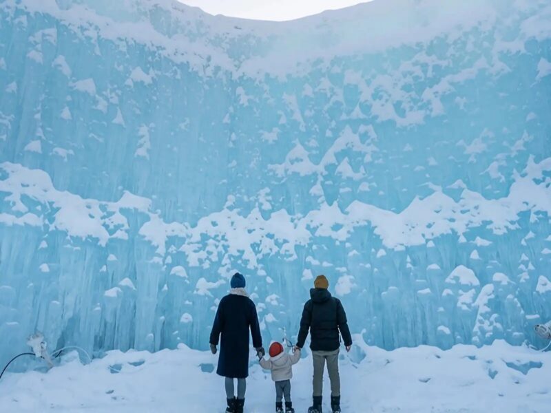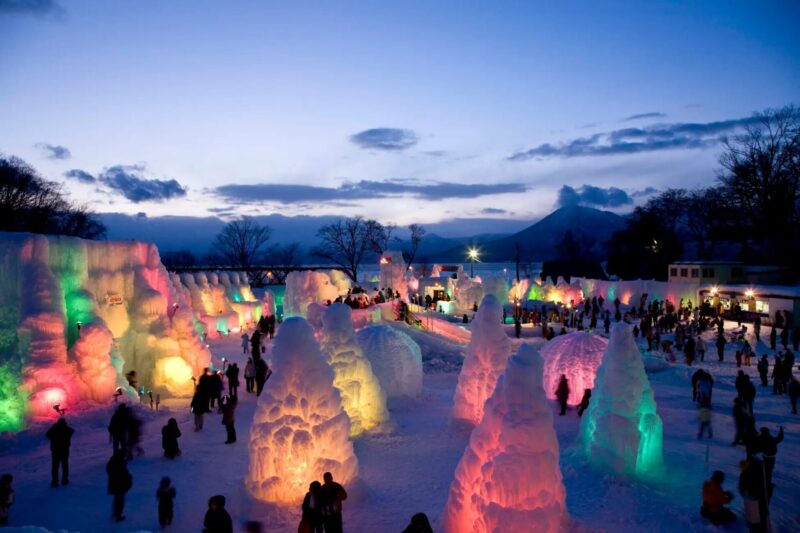 「2026千歳・支笏湖氷濤まつり」は、透明度の高い支笏湖の水を用いて造られる氷の造形が会場一帯に広がる冬の祭典です。昼は自然光を受けて“支笏湖ブルー”に輝き、夜はライトアップによって幻想的な氷の世界が広がります。