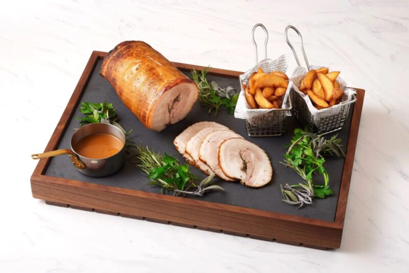 ライブキッチンでは、郷土料理「ポルケッタ」を提供します。豚肉をスパイスやハーブで味付けし、低温調理でじっくり仕上げた一品で、外はカリッと中はジューシーな食感が楽しめます。