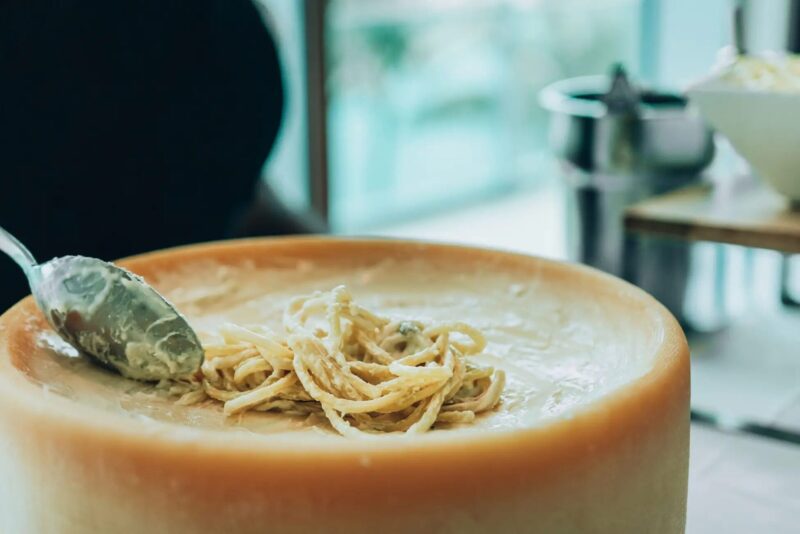 目玉メニューのひとつが「グラナパダーノのチーズパスタ」。大きなチーズの器の中で仕上げるスタイルで、出来立ての味わいを楽しめます。
