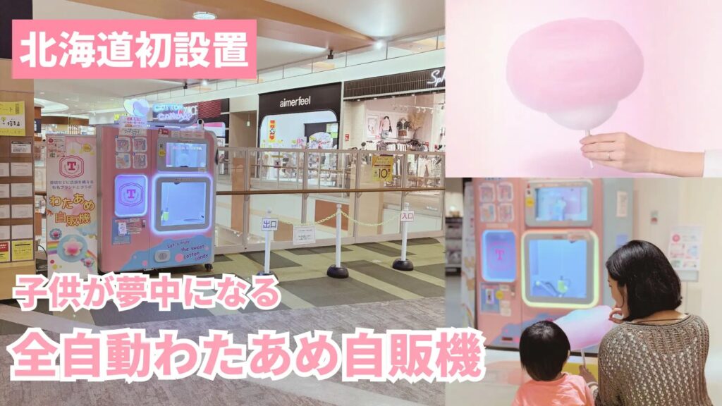 設置場所は、イオンモール札幌発寒の3階フードコート前です。自動でわたあめが作られていく工程は、お子さまはもちろん大人も見入ってしまう仕掛けとして紹介されています。