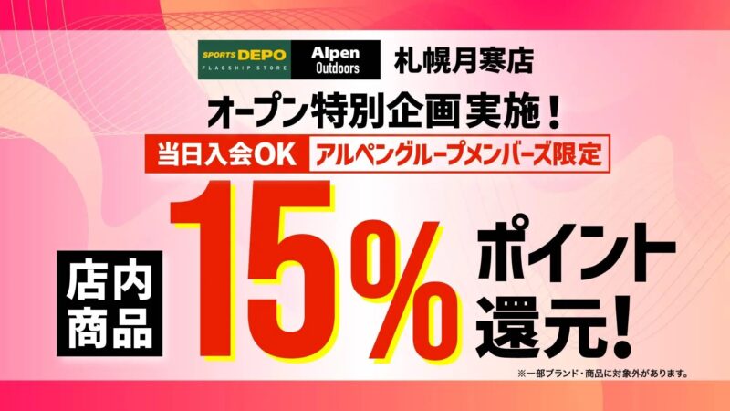 札幌月寒店のグランドオープンセールにあわせて、北海道内のスポーツデポ、アルペン、アルペンアウトドアーズ各店でも協賛セールを同時開催します。店内商品購入でアルペンポイント15%還元の企画は、協賛店舗でも実施されます。