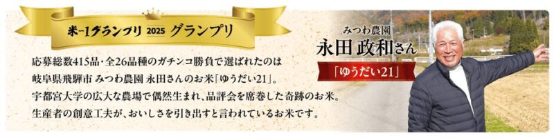 厳正な審査を経て、決勝に進んだ26品種の中から頂点に選ばれたのが、岐阜県飛騨市・みつわ農園の「ゆうだい21」です。今回のイベントでは、このグランプリ受賞米を、札幌市内のおむすび専門店3店舗で味わえます。