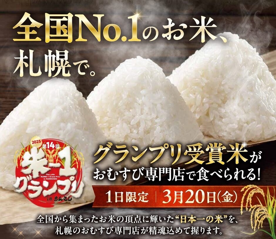 2026年3月20日、札幌市内の人気おむすび専門店3店舗で、第14回「米ー1グランプリ」でグランプリを受賞した岐阜県飛騨市・みつわ農園の「ゆうだい21」を使ったおむすびの特別提供イベントが開催されます。会場は「鮭まぶしおむすび亀太郎」「ヤマショウのごはん」「米屋札兵衛」の3店舗で、いずれも数量限定、なくなり次第終了です。