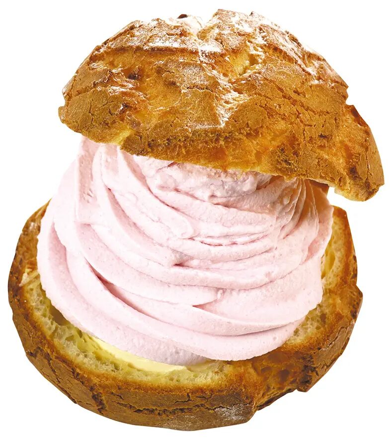 窯焼きシューケースに、軽いタイプのカスタードクリームと、神奈川県産八重桜を使った桜ミルキークリームをたっぷり絞った一品です。桜のやさしい香りと満足感をしっかり楽しめます。