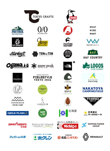 会場には、「TOKYO CRAFTS」や「CHUMS」といった人気ブランドのほか、「0/0 neru design works」「asimocrafts」などのガレージ系ブランドも並びます。さらに、道内各地のキャンプ場PRブースも出展し、総勢40以上の出展者が集まります。