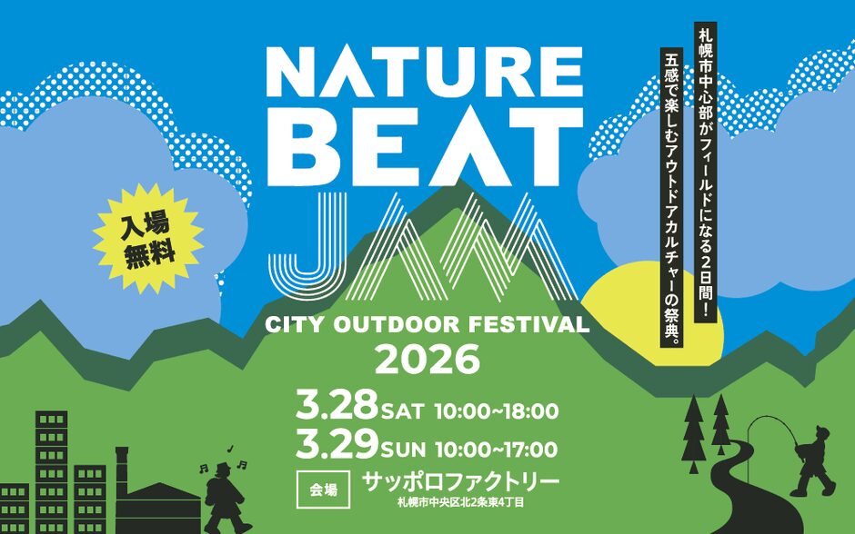 北海道新聞社と「あさってキャンプ」は、2026年3月28日と29日の2日間、サッポロファクトリーでアウトドアカルチャーの祭典「NATURE BEAT JAM 2026」を開催します。人気ブランドの展示販売やワークショップ、焚き火体験、ステージイベントなど、多彩なコンテンツがそろう“街フェス”です。