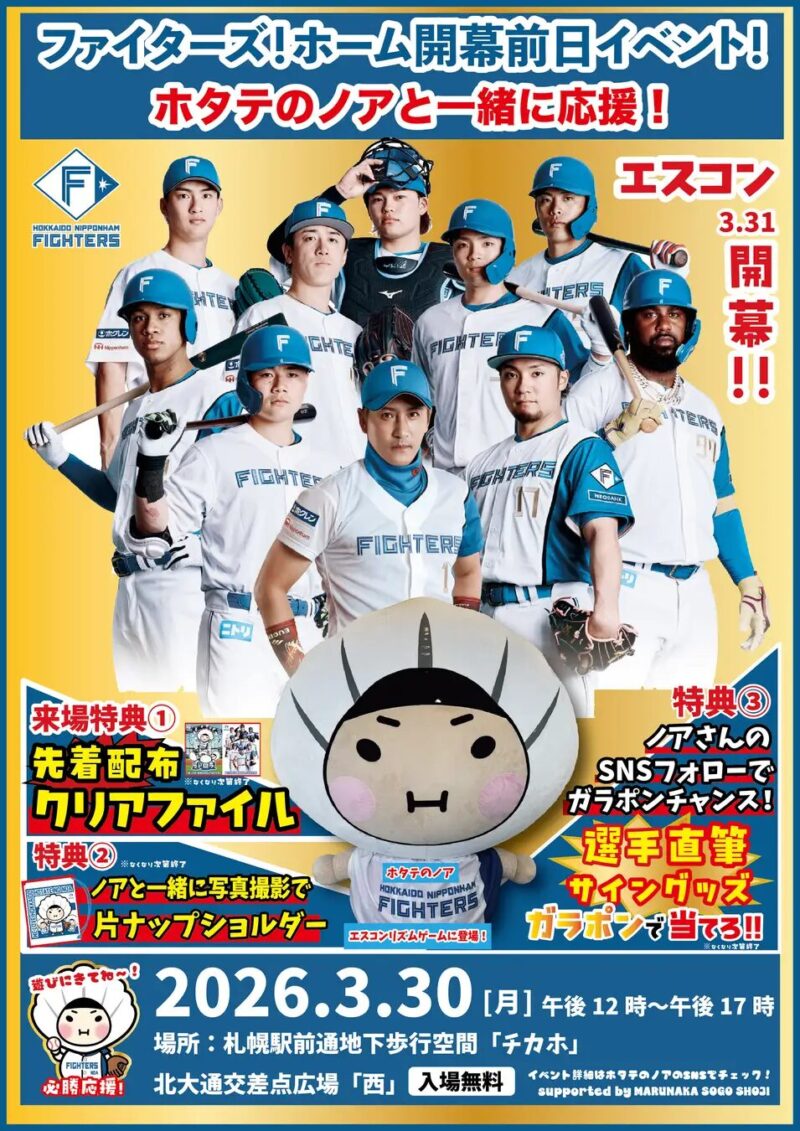 株式会社マルナカ相互商事は、北海道日本ハムファイターズのエスコンフィールド本拠地開幕戦前日となる2026年3月30日、札幌駅前通地下広場の北大通交差点広場(西)で、「ホタテのノア」と一緒にファイターズを応援しよう!イベントを開催します。会場は札幌駅からも立ち寄りやすいチ・カ・ホで、3月31日のホーム開幕戦に向けてファイターズを盛り上げる内容です。