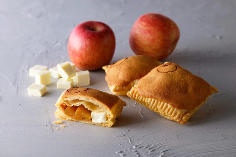 アップルホワイトショコラとカスタードショコラの2種類で、各580円(税込)です。パイの上にラング・ド・シャ生地をのせて焼き上げた、新食感のオリジナルパイです。