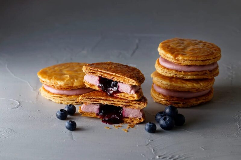 ザクリとした食感が特徴で、ひんやり冷やして楽しむパイです。ブルーベリーのフィリングとソースが入っています。600円(税込)です。