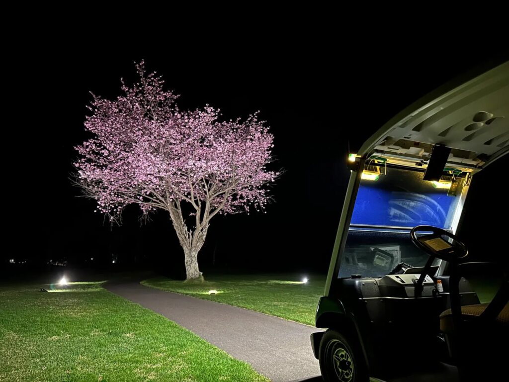 ゴルフカートで向かう、ゴルフ場の夜桜スポット