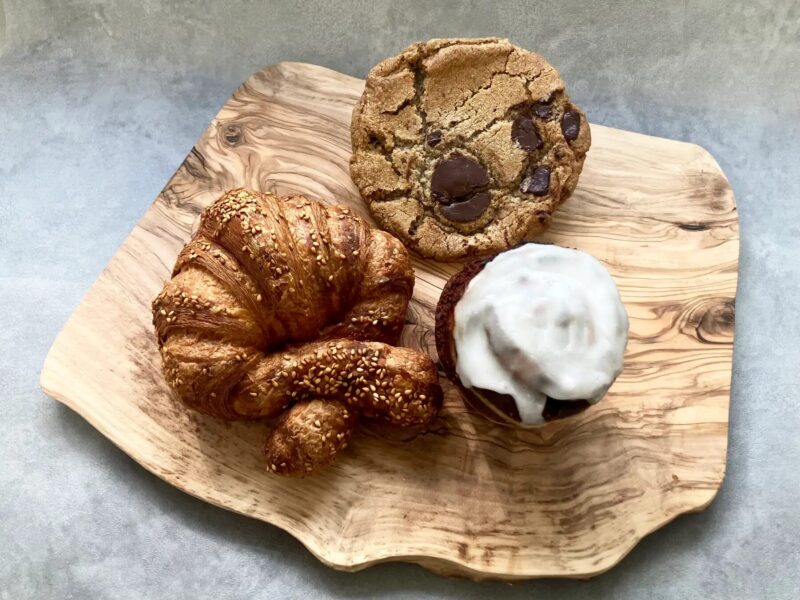 プレッツェルクロワッサンは、甘みのある生地に岩塩とゴマを振りかけた甘じょっぱい味わいが特徴です。チョコレートチャンククッキーは、甘い生地に大ぶりのチョコレートをたっぷり使ったアメリカンクッキー。コーヒーシナモンロールは、コーヒーシナモン風味のアーモンド生地を巻き込んで焼き上げ、アイシングで仕上げた一品です。