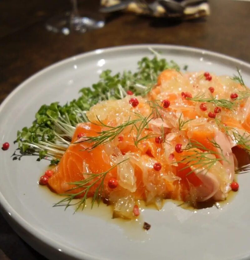 上品な脂と引き締まった身が特徴のサクラマスに、さっぱりとした酸味のラヴィゴットソースを合わせたメニューです。食欲を引き立てる味わいとして案内されています。