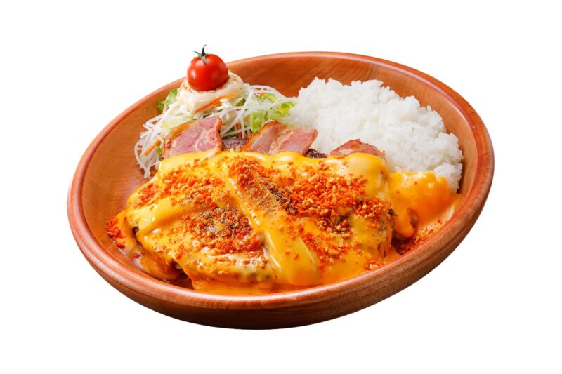濃厚なチーズソースをかけたハンバーグの中に、ゴーダチーズ、サムソーチーズ、ステッペンチーズのシュレッドチーズを詰め込んだメニューです。箸で割ると中からチーズがとろりとあふれ出します。今年は従来品と比べてチーズも増量し、さらにパワーアップしています。