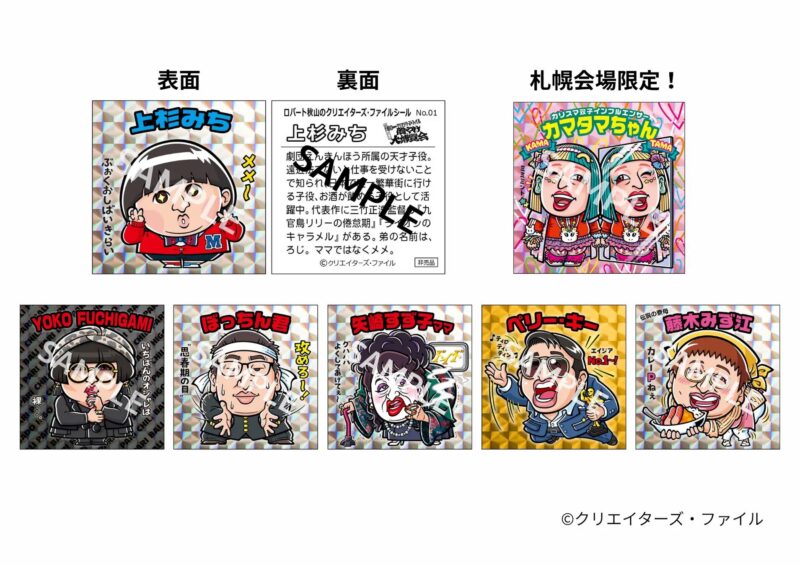 有料入場者には、描き下ろしオリジナルシールがランダムで1枚配布されます。絵柄は上杉みち、YOKO FUCHIGAMI、ぼっちん君、矢崎すず子、ペリー・キー、藤木みず江、そして札幌会場限定のカマタマちゃんを含む全7種です。