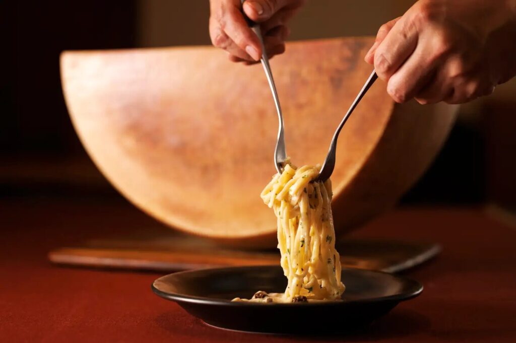 ホールチーズで絡めて仕上げるパスタで、ナポリタンとツナクリームの2種類から選べます。濃厚なコクと香りが楽しめるメニューです。