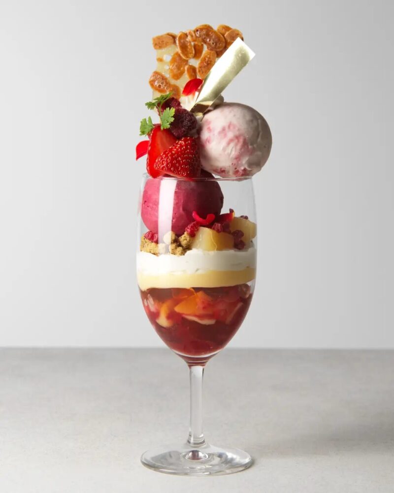 「ペッシュ フレーズ アルモニー」は、桃と苺の爽やかな味わいを主役にした春限定のパルフェです。赤桃を使ったアイスと白桃を使ったアイスに、恋香桃と苺ダイス、甘酸っぱいベリーソース入りのフルーツティージュレを合わせています。