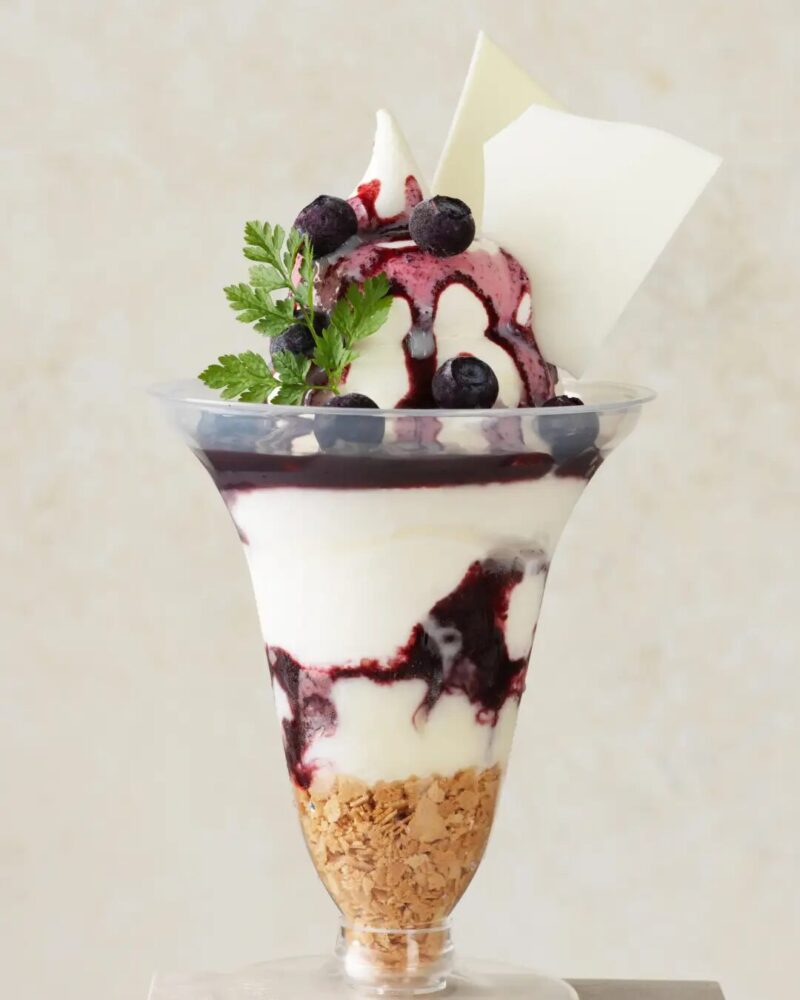 「リュクスクレームグラッセ ミルティーユ」は、ミルクの甘みとブルーベリーの酸味を合わせた贅沢なソフトクリームです。ミルキーでコク深いジャージーミルクアイスに、ブルーベリーソースとミルクソースをトッピングしています。