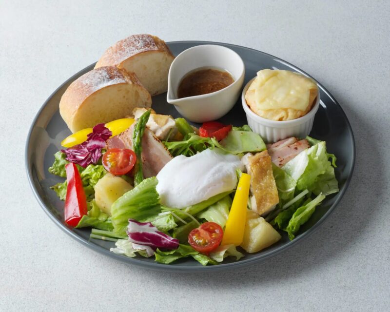 食事メニューでは、「季節のサラダプレート ~春野菜と蟹クレープグラタン~」が春限定で登場します。春キャベツ、じゃがいも、アスパラなどの春野菜に、ベーコンと鶏もも肉を添えたプレートです。